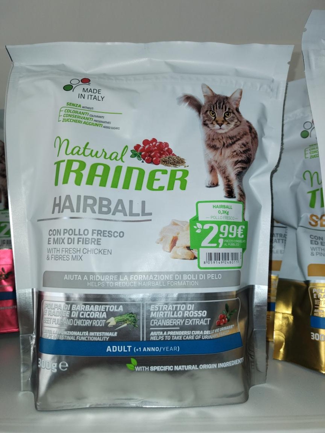 Per Gatto adulto, con pollo fresco e mix di fibre.Aiuta a ridurre la formazione di pelo. 300 g. Prezzo già ivato.